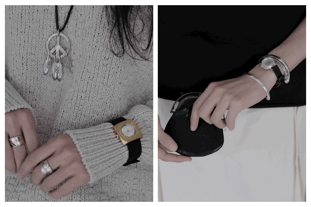 純銀、黃銅、白鑞、植鞣皮革,這些具備生命力的天然素材,隨著佩戴者的體溫、皮脂、環境濕度,以及每一段獨特的生活軌跡而緩緩氧化,物件因為使用而逐漸產生時間的痕跡,並沉積成專屬於使用者的樣貌。